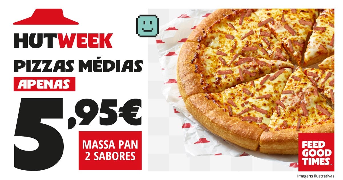 Pizzas médias PAN a 5,95€. Oferta válida de 23 a 27 de fevereiro 2026, exclusiva para pedidos e levantamentos nos restaurantes Pizza Hut aderentes.